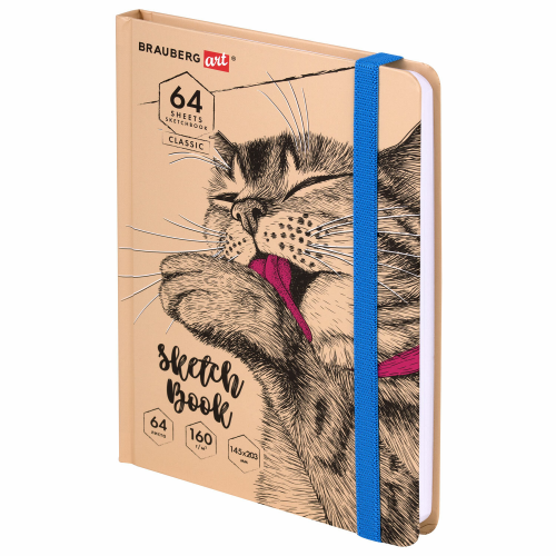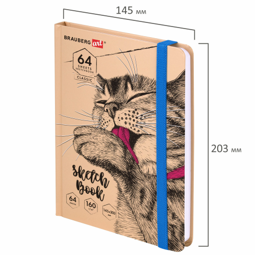 Скетчбук, белая бумага 160 г/м, 145х203 мм, 64 л., резинка, твердый, BRAUBERG ART CLASSIC "Это Кот", 114589