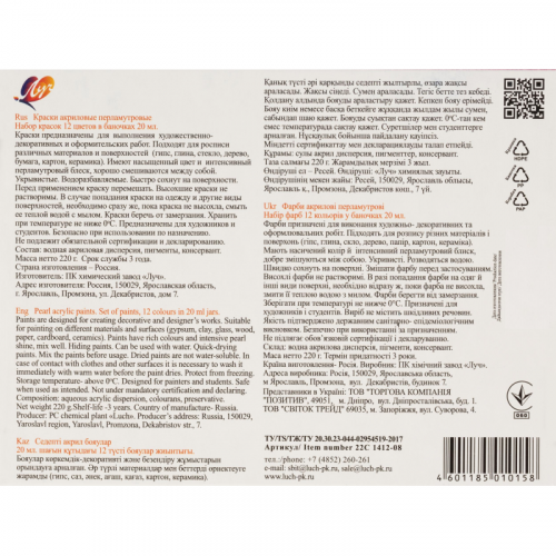 Краски акриловые Луч набор 12 цветов по 20 мл перламутровые Акриловые краски прекрасно подходят для художественных, декоративных и дизайнерских работ. Как и акварель, акрил легко разбавляются водой, но после высыхания его уже нельзя размочить, так как краска образует несмываемую пленку. Красочный слой эластичен, прочен и долговечен. Красками можно работать практически на любой поверхности. В набор входит 12 цветов - лимонный перламутровый, розовый перламутровый, красный перламутровый, голубой перламутровый, изумрудный перламутровый, черный перламутровый, белый перламутровый, фиолетовый перламутровый, оранжевый перламутровый, коричневый перламутровый, сиреневый перламутровый, зеленый перламутровый. Законодательные и технические документы