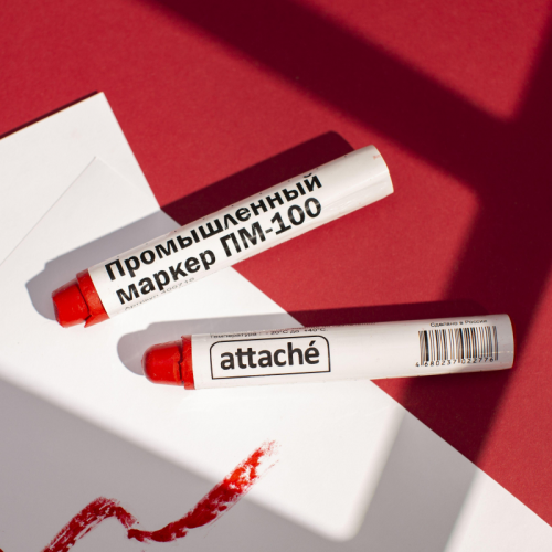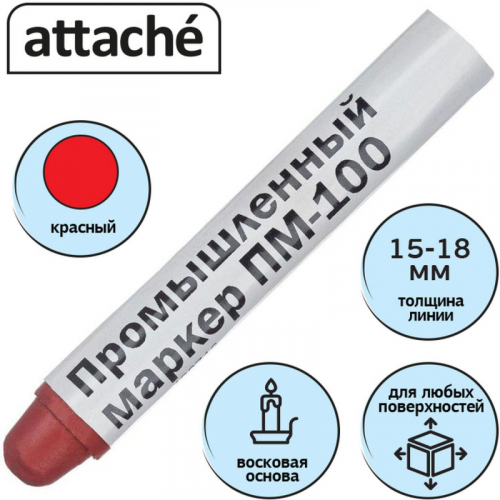 Маркер промышленный Attache для универсальной маркировки красный. Улучшенная производительность по любому типу поверхности: металл, дерево, бетон, пластик, керамика, резина, картон и бумага; по сухим, влажным, масленым, грязным, ржавым, грубым и гладким поверхностям. Надпись, сделанная твердой краской маркера не окисляется в процессе эксплуатации, пишущие характеристики не меняются по мере использования. Специальная формула твердой краски маркера быстро формирует оксидную пленку и становится устойчивой к агрессивным атмосферным воздействиям. Маркеры ПМ-100 не смывается водой, устойчив к ультрафиолетовому излучению, выцветанию, долговечен. Маркер изготовлен на восковой основе имеет твердый стержень, совершенно незаменим там, где работать с фетровым стержнем невозможно или он быстро портится. Маркер нетоксичен, не содержит свинец. Диапазон рабочих температур: от -20 до +40 градусов Цельсия. Цвет: красный. Размер: 117x18 мм.