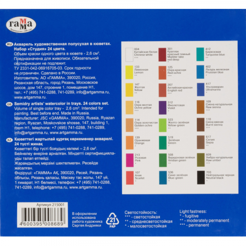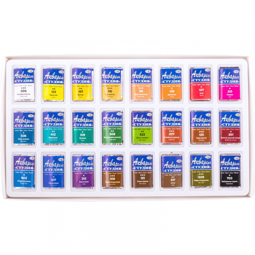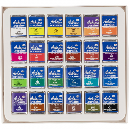 Краски акварельные Гамма Студия набор 24 цвета по 2.6 мл в кюветах матовые Акварельные краски Гамма 'Студия' предназначены для начинающих художников и студентов художественных училищ. Эти краски подходят для выполнения учебных работ, эскизов и набросков. Продукт обеспечивает оптимальное соотношение цены и качества. Краски изготовлены на основе гуммиарабика. Набор включает 24 цвета. В него входят: китайская белая, лимонная, жёлтая, охра жёлтая, охра оранжевая, оранжевая, алая, розовая, сине-зелёная, бирюзовая, зелёная, виридиновая зелёная, жёлто-зелёная, английская красная, охра красная, краплак красный тёмный, ультрамарин, лазурь железная, фиолетовая, сиена натуральная, сиена жжённая, сиена, умбра натуральная, нейтрально-чёрная. Краски полусухие и сохнут при температуре не выше 40C. После высыхания они становятся матовыми. Цвета легко смешиваются и размываются. Краска легко набирается из кюветы. Набор удобен для использования как в студии, так и на пленэрах. Продукт подходит для создания ярких и свежих работ. Высокая концентрация пигментов обеспечивает насыщенность цвета. Набор идеален для обучения и практики в живописи.