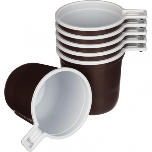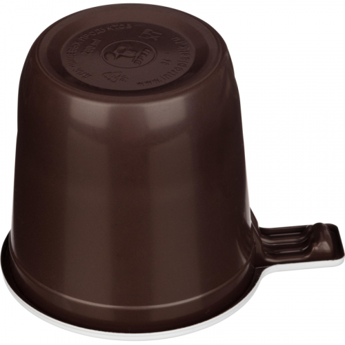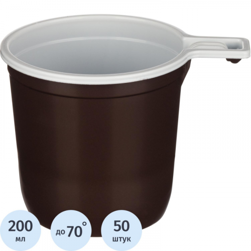 Чашка одноразовая пластиковая 200 мл коричневая/белая 50 штук в упаковке Комус Бюджет Одноразовая чашка Комус двухцветная, коричневая с белым. Ручка делает использование более комфортным, не позволяя обжечься. Полипропилен, из которого изготовлена чашка, выдерживает высокие и низкие температуры. Объем - 200 мл. В упаковке 50 штук, в транспортном коробе 25 упаковок. Данная продукция обладает пониженной плотностью/весом, при некорректной транспортировке или использовании возможна деформация и механические повреждения (разрыв). Верхний диаметр: 74 мм. Нижний диаметр: 52 мм. Высота: 70 мм. Область применения: посуда одноразового использования для холодных и горячих пищевых продуктов. Во избежание деформации ручки, использовать при температуре воды не более (70 5) °С. Товар произведен под контролем 'Комус'. Мы специально позаботились о Партнерах, которые превыше всего ценят качество и комфорт и разработали линейку Одноразовой посуды самых востребованных размеров для обеспечения быстрого питания в офисе, образовательных и производственных учреждениях, сферы гостеприимства и общественного питания и многих других. Производство расположено в России, что гарантирует постоянный контроль качества и оптимальные цены. Законодательные и технические документы.