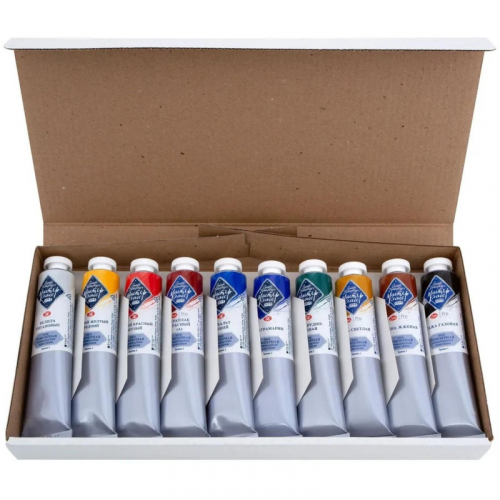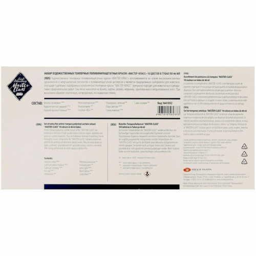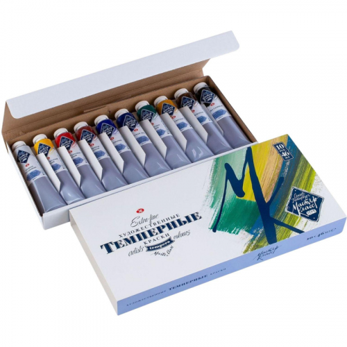 Краски темперные Мастер-класс набор 10 цветов по 46 мл в тубах Краски темперные "Мастер-класс" изготавливаются на основе высококачественных органических и неорганических пигментов и поливинилацетатной дисперсии и являются традиционным материалом для живописи. Благодаря тщательно отобранным компонентам темперные краски серии "Мастер-класс" прекрасно подходят для живописных и декоративно-дизайнерских работ. Они легко наносятся на бумагу, картон, дерево. При высыхании образуют эластичную, непрозрачную, несмываемую пленку. Состав набора: белила титановые, охра светлая, кадмий желтый средний, кадмий красный светлый или кадмий красный темный, железная красная или краплак красный, ультрамарин или кобальт синий, голубая ФЦ, окись хрома или изумрудно-зеленая, умбра жженая или сиена жженая, сажа газовая. Размер упаковки: 29,5x14,2x3,3 см. Законодательные и технические документы