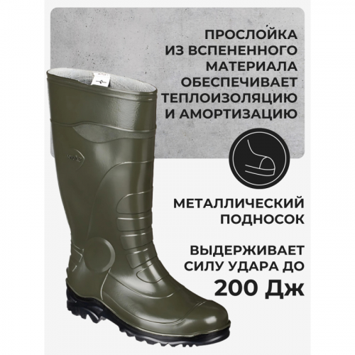 Сапоги рабочие мужские 173 ПВХ оливковые с металлическим подноском размер 39. Рекомендуются для использования на промышленных предприятиях, в строительстве и других сферах с повышенной нагрузкой на обувь. Верх и подошва выполнены из ПВХ. Сапоги оснащены металлическим подноском, выдерживающим силу удара до 200 Дж, что обеспечивает защиту от механических повреждений. Подошва крепится к верху цельнолитым методом, что увеличивает прочность и долговечность изделия. Прослойка из вспененного материала обеспечивает теплоизоляцию и амортизацию, снижая усталость ног при длительном использовании. Обувь имеет защиту от общих производственных загрязнений, от механических повреждений, ударов, истирания, от растительных, животных масел и жиров, скольжения, кислот и щелочей, нефти и нефтепродуктов, а также, от воздействия влаги. Высота голенища составляет 36 см. Сапоги соответствуют требованиям ТР ТС 019/2011. Гарантийный срок эксплуатации - 30 дней при соблюдении правил ухода и хранения. Законодательные и технические документы