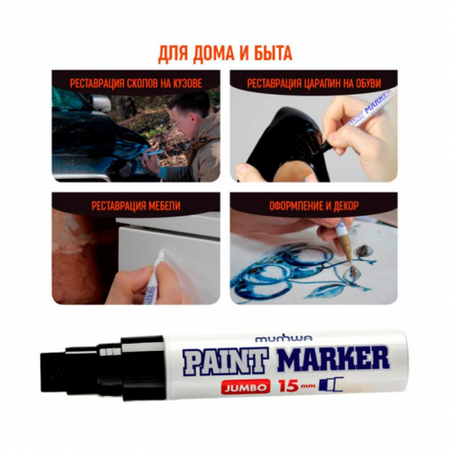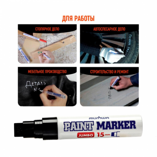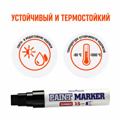 Маркер-краска MunHwa - профессиональный лаковый маркер на нитрооснове. Paint Marker MunHwa Jumbo предназначен для объемной маркировки по металлу, дереву, резине, бетону, стеклу, коже. Цвет чернил - черный, диаметр пишущего узла - 15 мм. Корпус маркера изготовлен из прочного алюминия. Клапанный механизм пишущего узла исключает растекание и разбрызгивание краски, преждевременное пересыхание маркера, срок годности 5 лет.Благодаря высококачественным чернилам, краска ложится на поверхность равномерным и однородным слоем, полностью закрашивая обрабатываемую поверхность, быстро сохнет. После высыхания, надписи обладают свето и водостойкостью, термостойкостью, устойчивостью к механическим воздействиям. Инструкция по применению: 1)Встряхнуть маркер с закрытым колпачком. 2)Открыть колпачок. Удерживая маркер в вертикальном положении, несколько раз надавить стержнем на поверхность до тех пор, пока краска не поступит на пишущих узел. 3)Выполнить надпись или рисунок. Дать составу высохнуть в течение 40-60 секунд. 4)Плотно закрыть колпачок.