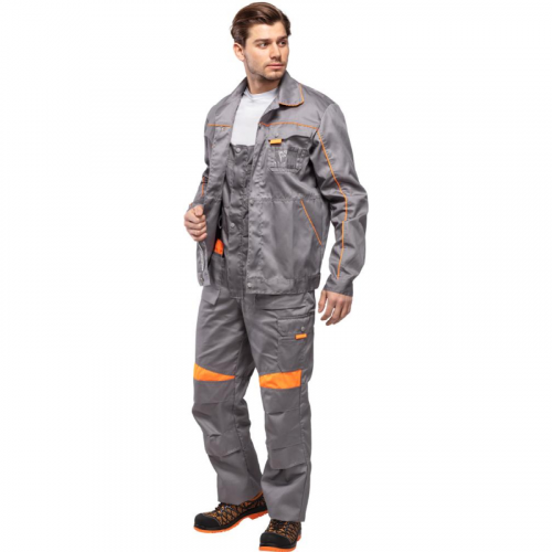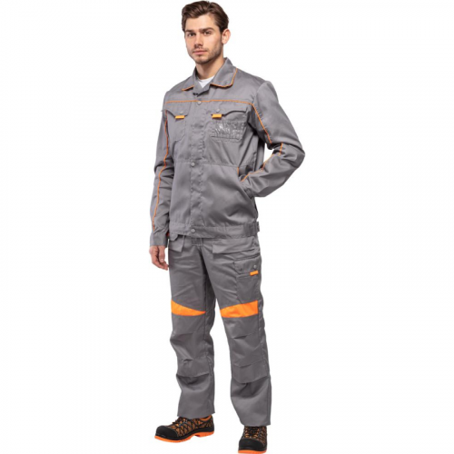Спецодежда летняя костюм мужской л29-КПК состоит из укороченной куртки на поясе и полукомбинезона. Куртка имеет центральную застежку на молнию, закрытую планкой на кнопках. Куртка имеет 2 верхних накладных фигурных кармана, застегивающихся на кнопку. На левом верхнем кармане дополнительно настрочен карман под бейдж. В нижней части куртки располагаются 2 вместительных накладных кармана с боковым входом. Куртка имеет складки на спине для свободы движения. На локтях имеются усиления. Пояс куртки регулируется патами на кнопках. Полукомбинезон с высокими грудкой и спинкой, бретели имеют вставки из резинки, регулируются по длине и застегиваются на фастексы. Застежка полукомбинезона на молнию, закрытую планкой на кнопках. По линии талии имеются двойные шлевки под ремень. На полукомбинезоне имеется множество функциональных карманов: накладные и навесные. В районе коленей имеются усиления со входом под амортизационные вставки. Цвет: серый с оранжевой отделкой. Материал: 65% полиэстер, 35% хлопок. Плотность: 240 г/кв.м. Размер: 44-46. Рост: 182-188. Стандарт: ГОСТ 12.4.280-2014 и ТР ТС 019/2011. Сфера применения: логистика , легкая промышленность , тяжелая промышленность , строительство , озеленение , автомобильная.Коллекция л29 представлена комплектами куртка и полукомбинезон л29-КПК в двух вариантах расцветки: черный с красной отделкой и темно-серый с отделкой ярко-оранжевого цвета.