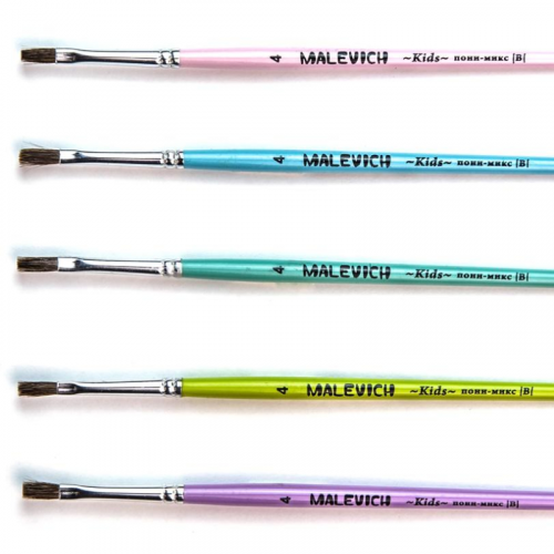 Кисть художественная Малевичъ Kids плоская коровий ворс №4 Товар поставляется без возможности выбора цвета. Материал пучка кисти: синтетика, пони, коровий ворс. Сочетание отличного по характеристикам волоса и красочных разноцветных ручек делает эти кисти уникальными и любимыми юными художниками. Они отлично подойдут для акварели и гуаши. Длина ворса (выставка) короткая. Номер кисти соответствует диаметру в мм. Внимание! Товар поставляется в нескольких вариантах цвета/дизайна (без возможности выбора).