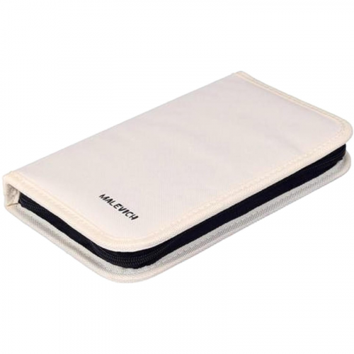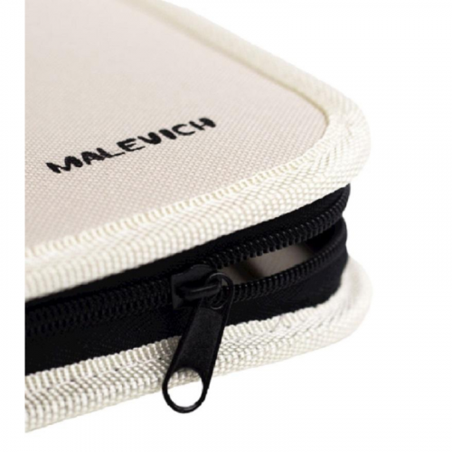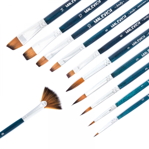 Набор кистей Малевичъ Andy синтетика (12 штук в наборе) Состав набора: пенал Малевичъ для хранения кистей размер 16x25 см, цвет - бежевый; кисти Andy (круглые - № 0, 1, 3, 5, 8; плоские - № 6, 10, 12; скошенная № 14; плоскоовальные - № 6, 12; веерная - № 8). Кисти из синтетики серии Andy - это мягкая универсальная синтетика, которая подходит практически для любых видов красок. Ими удобно работать с гуашью, акварелью, акрилом, темперой. Маслом можно работать в лессировочной технике с разбавителем. Синтетика рыжего цвета с темным кончиком, ручка покрыта синим лаком, ворс закреплен втулкой из латуни с двойной обжимкой. Привлекательный внешний вид и понятная маркировка для удобства покупателя. Ручка кисти короткая - 14 см. Длина ворса (выставка) короткая. Номер кисти соответствует диаметру пучка в мм.