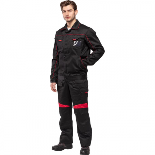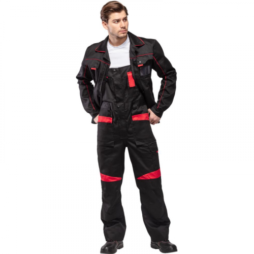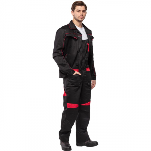 Спецодежда летняя костюм мужской л29-КПК состоит из укороченной куртки на поясе, и полукомбинезона. Куртка имеет центральную застежку на молнию, закрытую планкой на кнопках. Куртка имеет 2 верхних накладных фигурных кармана, застегивающихся на кнопку. На левом верхнем кармане дополнительно настрочен карман под бейдж. В нижней части куртки располагаются 2 вместительных накладных кармана с боковым входом. Куртка имеет складки на спине для свободы движения. На локтях имеются усиления. Пояс куртки регулируется патами на кнопках. Полукомбинезон с высокими грудкой и спинкой, бретели имеют вставки из резинки, регулируются по длине и застегиваются на фастексы. Застежка полукомбинезона на молнию, закрытую планкой на кнопках. По линии талии имеются двойные шлевки под ремень. На полукомбинезоне имеется множество функциональных карманов: накладные и навесные. В районе коленей имеются усиления со входом под амортизационные вставки. Цвет: черный с красной отделкой. Материал: 65% полиэстер, 35% хлопок. Плотность: 240 г/кв.м. Размер: 44-46. Рост: 170-176. Стандарт: ГОСТ 12.4.280-2014 и ТР ТС 019/2011. Сфера применения: логистика , легкая промышленность , тяжелая промышленность , строительство , озеленение , автомобильная. Коллекция л29 представлена комплектами куртка и полукомбинезон л29-КПК в двух вариантах расцветки: черный с красной отделкой и темно-серый с отделкой ярко-оранжевого цвета.