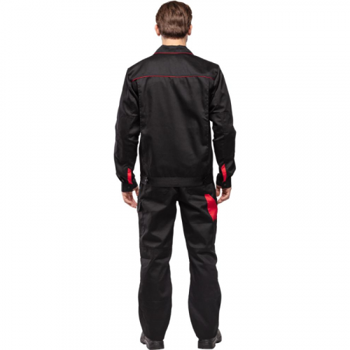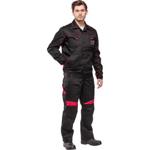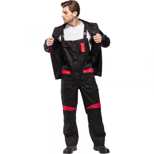 Спецодежда летняя костюм мужской л29-КПК состоит из укороченной куртки на поясе, и полукомбинезона. Куртка имеет центральную застежку на молнию, закрытую планкой на кнопках. Куртка имеет 2 верхних накладных фигурных кармана, застегивающихся на кнопку. На левом верхнем кармане дополнительно настрочен карман под бейдж. В нижней части куртки располагаются 2 вместительных накладных кармана с боковым входом. Куртка имеет складки на спине для свободы движения. На локтях имеются усиления. Пояс куртки регулируется патами на кнопках. Полукомбинезон с высокими грудкой и спинкой, бретели имеют вставки из резинки, регулируются по длине и застегиваются на фастексы. Застежка полукомбинезона на молнию, закрытую планкой на кнопках. По линии талии имеются двойные шлевки под ремень. На полукомбинезоне имеется множество функциональных карманов: накладные и навесные. В районе коленей имеются усиления со входом под амортизационные вставки. Цвет: черный с красной отделкой. Материал: 65% полиэстер, 35% хлопок. Плотность: 240 г/кв.м. Размер: 44-46. Рост: 182-188. Стандарт: ГОСТ 12.4.280-2014 и ТР ТС 019/2011. Сфера применения: логистика , легкая промышленность , тяжелая промышленность , строительство , озеленение , автомобильная.Коллекция л29 представлена комплектами куртка и полукомбинезон л29-КПК в двух вариантах расцветки: черный с красной отделкой и темно-серый с отделкой ярко-оранжевого цвета.