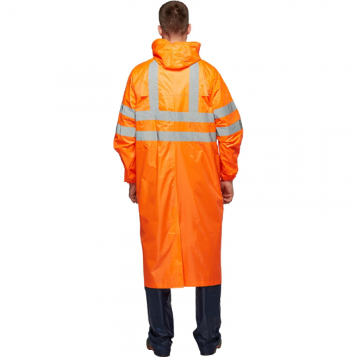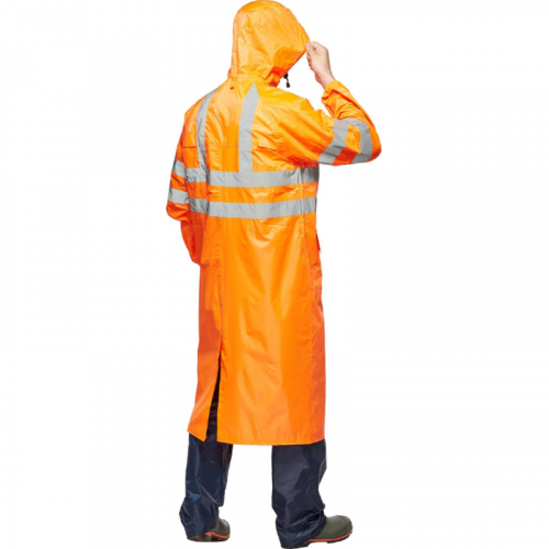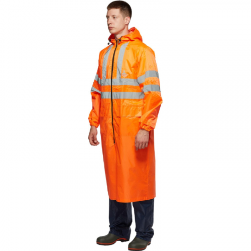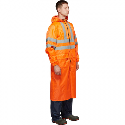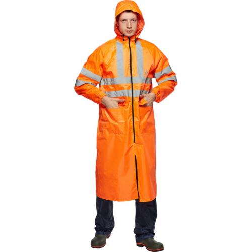 Плащ влагозащитный Тайфун ПВХ на молнии оранжевый с СОП (размер 60-62, рост 182-188). Плащ "Тайфун" оранжевый обеспечивает максимальную защиту от дождя, ветра, снега и загрязнений. Он также гарантирует безопасность в условиях плохой видимости благодаря яркому оранжевому цвету и светоотражающим элементам. Этот плащ идеально подходит для работы в дорожных и коммунальных службах, городском хозяйстве, транспорте и на открытом воздухе. Плащ выполнен из полиэфира с ПВХ, плотность ткани - 200 г/кв.м. Это позволяет эффективно защищать от влаги и загрязнений. Проклеенные швы и ветрозащитная планка на молнии обеспечивают полную защиту от протечек. Модель имеет прямой силуэт с рукавами реглан. Капюшон состоит из 3 частей и регулируется с помощью шнура, что увеличивает эргономичность. Застежка на витой молнии с внутренней ветрозащитной планкой препятствует попаданию влаги. Манжеты на рукавах обеспечивают дополнительную защиту при активном движении. Вентиляционные отверстия в области подмышечных впадин и кокетки способствуют выводу влаги из внутреннего пространства. Шлица на спинке плаща придает свободу движений. На плащ нанесены светоотражающие полосы шириной 5 см, что повышает видимость в темное время суток, в соответствии с ГОСТом. Стандарт: ТР ТС 019/2011, ГОСТ 12.4.281-2014. Рекомендации по уходу: стирка при температуре не выше 30°C, не использовать отбеливатели. размер. Цвет на изображении товара в интернет-магазине или в печатном каталоге может отличаться от оригинала из-за особенностей цветопередачи. ЗАКОНОДАТЕЛЬНЫЕ И ТЕХНИЧЕСКИЕ ДОКУМЕНТЫ: