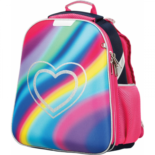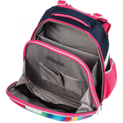 Ранец для девочки эргономичной обтекаемой формы. Жесткий каркас. Анатомическая спинка. Ранец выполнен из полиэстера. Ранец имеет два отдела на молнии. В основном отделении - гибкая перегородка, предназначенная для удобного хранения книг и тетрадей, и прозрачный карман с вкладышем для расписания уроков. Во втором - сетчатый карман и карман-органайзер. Благодаря устойчивому дну и ножкам ребенку будет удобно находить нужные учебники и тетради. Боковые карманы с сеточкой подходят для переноски маленькой бутылочки с водой и прочих небольших аксессуаров. Ранец оснащен двумя ручками: одна узкая, чтобы вешать на парту, вторая широкая и мягкая, чтобы удобно носить в руке. Широкие удобные лямки из воздухообменного сетчатого материала регулируются по длине и по спинке ранца - удобно подогнать под рост ребенка. Грудная застежка помогает лучше зафиксировать ранец на теле и снять часть нагрузки с плеч. Плотное дно удерживает форму. Для дополнительной безопасности ребенка в темное время суток светоотражатели на лямках и над боковыми карманами. Размер: 320x215x360 мм. Особенности: рисунок глиттером.Цвет подкладки рюкзака может отличаться от варианта, представленного на фото. Законодательные и технические документы