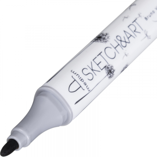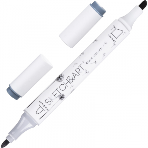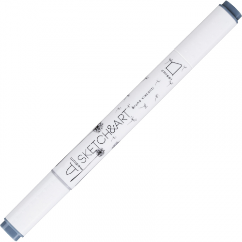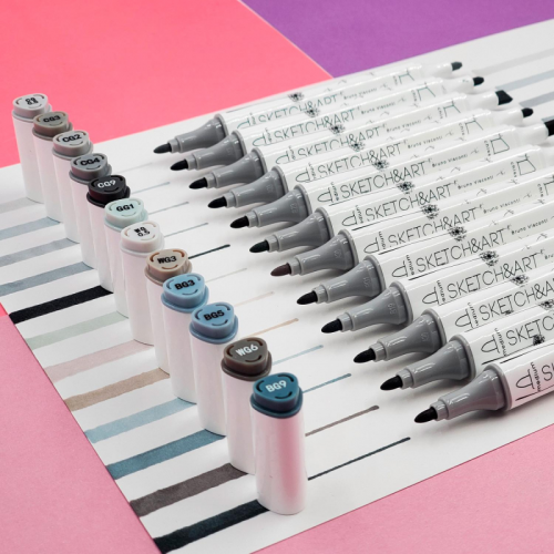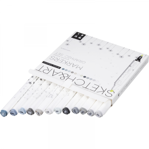 Набор маркеров для скетчинга Sketch&Art Графика двухсторонние 12 цветов (толщина линии 1-5 мм) Высококачественные профессиональные маркеры Sketch&Art предназначены для рисования, набросков, дизайнерских работ. В наборе 12 цветов, специально подобранных под тему. Эргономичный трёхгранный корпус из полипропилена - лёгкий и ударопрочный. Плотно защёлкивающиеся колпачки обеспечивают долгую сохранность чернил от высыхания, а рельефное нанесение в форме точек на их поверхность предотвращает скольжение руки при открывании. Маркер имеет два наконечника из износостойкого волокна - пулевидный с шириной линии 1 мм и скошенный, позволяющий варьировать ширину линии от 1 до 5 мм. Перманентные чернила на спиртовой основе не токсичны и быстро сохнут на поверхности, оставляя яркий след. Возможность многократно заправлять чернилами маркер значительно продлевает срок его службы. Маркеры хорошо ложатся на бумагу разной фактуры и плотности. Более гладкая бумага даёт больше простора для смешения цветов и создания градиентов. Также этот художественный материал можно использовать для создания рисунков и на стекле, и на светлом пластике, предварительно обезжирив их поверхность. Стойкость и яркость цвета гарантированы. Следы от маркеров легко отстирываются и отмываются с помощью моющих средств. Маркеры упакованы в картонную упаковку с приятным бархатистым покрытием Soft Touch и узнаваемым дизайном всей линейки Sketch&Art. Для комфортного открывания верхний клапан упаковки снабжён специальным язычком. Цвета в наборе: белый, серый, светло-серый, нежно-серый, тёмно-серый, серый, светло-серый, нежно-серый, тёмно-серый, голубой, тёмно-зелёный.