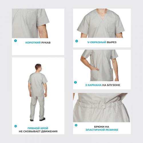 Костюм хирургический м05-КБР серый (размер 52-54, рост 170-176)Костюм м05-КБР предназначен для защиты от общих производственных загрязнений. Универсальная модель подходит для мужчин и женщин, обеспечивая свободу движений и комфорт в процессе работы. МатериалыОсновная ткань: Ти-Си, плотность 120 г/м#, состав 65% полиэстер, 35% хлопок.Защитные свойстваЗ - защита от общих производственных загрязнений.Особенности дизайна и конструкцииТип силуэта и посадка свободные, не стесняют движения. Куртка с коротким рукавом, тремя накладными карманами (один нагрудный, два боковых). Брюки прямые, с эластичной резинкой на талии, карманы на брюках отсутствуют.Рекомендации по уходуСтирка при температуре не выше 40 C.Запрещено отбеливание и химчистка.Глажение при температуре до 110 C.Продукция не является изделием медицинского назначения, производится согласно требованиям ГОСТ 12.4.280-2014. Рекомендуется для работников медицинских, санитарных, лечебно-профилактических и других организаций или учреждений здравоохранения: высший, средний и младший персонал (врачи, медицинские сестры, акушеры, техники, лаборанты, массажисты, фармацевты, сиделки, санитарки и т.д.), административно-хозяйственной группы (заведующие, кладовщики, кухонный персонал и т.д.). target="_blankПодобрать размерЦвет товара на изображении в интернет-магазине или в печатном каталоге может отличаться от оригинала из-за особенностей цветопередачи монитора.