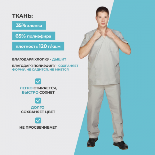 Костюм хирургический м05-КБР серый (размер 60-62, рост 158-164)Костюм м05-КБР предназначен для защиты от общих производственных загрязнений. Универсальная модель подходит для мужчин и женщин, обеспечивая свободу движений и комфорт в процессе работы. МатериалыОсновная ткань: Ти-Си, плотность 120 г/м#, состав 65% полиэстер, 35% хлопок.Защитные свойстваЗ - защита от общих производственных загрязнений.Особенности дизайна и конструкцииТип силуэта и посадка свободные, не стесняют движения. Куртка с коротким рукавом, тремя накладными карманами (один нагрудный, два боковых). Брюки прямые, с эластичной резинкой на талии, карманы на брюках отсутствуют.Рекомендации по уходуСтирка при температуре не выше 40 C.Запрещено отбеливание и химчистка.Глажение при температуре до 110 C.Продукция не является изделием медицинского назначения, производится согласно требованиям ГОСТ 12.4.280-2014. Рекомендуется для работников медицинских, санитарных, лечебно-профилактических и других организаций или учреждений здравоохранения: высший, средний и младший персонал (врачи, медицинские сестры, акушеры, техники, лаборанты, массажисты, фармацевты, сиделки, санитарки и т.д.), административно-хозяйственной группы (заведующие, кладовщики, кухонный персонал и т.д.). target="_blankПодобрать размерЦвет товара на изображении в интернет-магазине или в печатном каталоге может отличаться от оригинала из-за особенностей цветопередачи монитора.