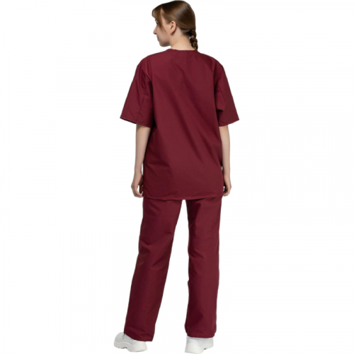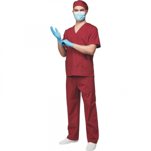 Костюм хирургический м05-КБР бордовый (размер 56-58, рост 182-188)Костюм м05-КБР предназначен для защиты от общих производственных загрязнений. Универсальная модель подходит для мужчин и женщин, обеспечивая свободу движений и комфорт в процессе работы. МатериалыОсновная ткань: Ти-Си, плотность 120 г/м#, состав 65% полиэстер, 35% хлопок.Защитные свойстваЗ - защита от общих производственных загрязнений.Особенности дизайна и конструкцииТип силуэта и посадка свободные, не стесняют движения. Куртка с коротким рукавом, тремя накладными карманами (один нагрудный, два боковых). Брюки прямые, с эластичной резинкой на талии, карманы на брюках отсутствуют.Рекомендации по уходуСтирка при температуре не выше 40 C.Запрещено отбеливание и химчистка.Глажение при температуре до 110 C.Продукция не является изделием медицинского назначения, производится согласно требованиям ГОСТ 12.4.280-2014. Рекомендуется для работников медицинских, санитарных, лечебно-профилактических и других организаций или учреждений здравоохранения: высший, средний и младший персонал (врачи, медицинские сестры, акушеры, техники, лаборанты, массажисты, фармацевты, сиделки, санитарки и т.д.), административно-хозяйственной группы (заведующие, кладовщики, кухонный персонал и т.д.). target="_blankПодобрать размерЦвет товара на изображении в интернет-магазине или в печатном каталоге может отличаться от оригинала из-за особенностей цветопередачи монитора.
