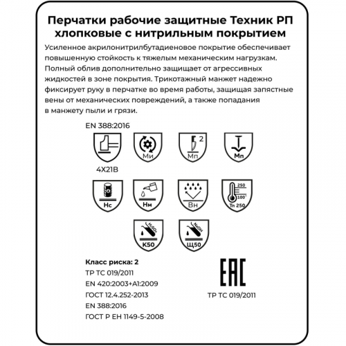 Перчатки рабочие защитные Manipula Specialist Техник РП TN-03/MG-226 хлопковые с нитрильным покрытием синие (размер 10, XL). Предназначены для защиты рук от механических воздействий, нефти, нефтепродуктов, кислот и щелочей. Применяются в нефтегазовой, строительной, химической промышленности и других областях, где требуется защита от агрессивных веществ и высоких механических нагрузок.Перчатки имеют тройное нитриловое покрытие, которое обеспечивает повышенную стойкость к механическим повреждениям. Основа из 100% хлопка (джерси) гарантирует комфорт, абсорбцию влаги и поглощение ударных нагрузок. Полный облив обеспечивает дополнительную защиту от кислот и щелочей в области покрытия. Трикотажная манжета надежно фиксирует перчатку на руке, защищая запястье от повреждений и предотвращая попадание пыли и грязи.Перчатки прошли антибактериальную обработку Sanitized Actifresh, что предотвращает развитие микробной среды и устраняет неприятные запахи. Возможна многократная машинная стирка при 40°C.Эксплуатационные уровни EN: - EN 388: 4X21B.Защитные свойства ТР ТС: - Ми, Мп, Нс, Нм, Вн, К50, Щ50.Класс риска: 2Соответствие стандартам: - ТР ТС 019/2011.- ГОСТ 12.4.252-2013.- ГОСТ EN 388-2016.- ГОСТ EN 420-2003+A1-2009.- ГОСТ Р ЕН 1149-5-2008.Цвет на изображении товара может отличаться от оригинала из-за особенностей цветопередачи монитора.ЗАКОНОДАТЕЛЬНЫЕ И ТЕХНИЧЕСКИЕ ДОКУМЕНТЫ: