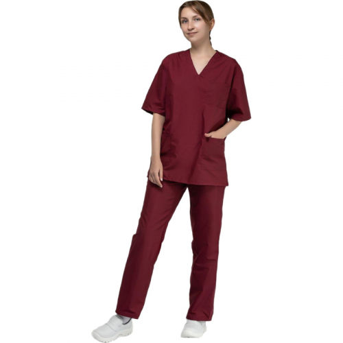 Костюм хирургический м05-КБР бордовый (размер 48-50, рост 170-176)Костюм м05-КБР предназначен для защиты от общих производственных загрязнений. Универсальная модель подходит для мужчин и женщин, обеспечивая свободу движений и комфорт в процессе работы. МатериалыОсновная ткань: Ти-Си, плотность 120 г/м#, состав 65% полиэстер, 35% хлопок.Защитные свойстваЗ - защита от общих производственных загрязнений.Особенности дизайна и конструкцииТип силуэта и посадка свободные, не стесняют движения. Куртка с коротким рукавом, тремя накладными карманами (один нагрудный, два боковых). Брюки прямые, с эластичной резинкой на талии, карманы на брюках отсутствуют.Рекомендации по уходуСтирка при температуре не выше 40 C.Запрещено отбеливание и химчистка.Глажение при температуре до 110 C.Продукция не является изделием медицинского назначения, производится согласно требованиям ГОСТ 12.4.280-2014. Рекомендуется для работников медицинских, санитарных, лечебно-профилактических и других организаций или учреждений здравоохранения: высший, средний и младший персонал (врачи, медицинские сестры, акушеры, техники, лаборанты, массажисты, фармацевты, сиделки, санитарки и т.д.), административно-хозяйственной группы (заведующие, кладовщики, кухонный персонал и т.д.). target="_blankПодобрать размерЦвет товара на изображении в интернет-магазине или в печатном каталоге может отличаться от оригинала из-за особенностей цветопередачи монитора.