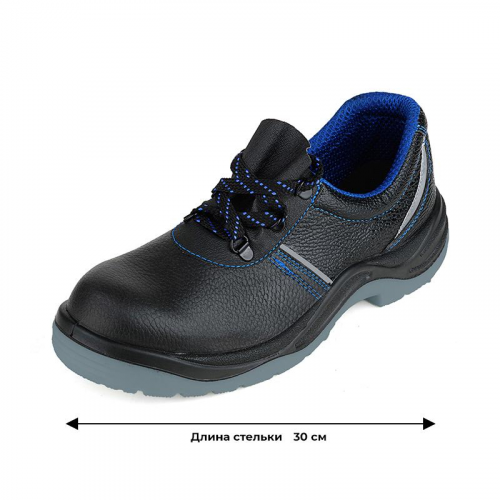 Полуботинки рабочие Prosafe 23Т ПУ-ТПУ кожа черные с металлическим подноском размер 46. Полуботинки предназначены для защиты от механических воздействий, общих производственных загрязнений, ударов, от кислот и щелочи, нефти и нефтепродуктов. Верх обуви изготовлен из искусственной кожи. Подкладка выполнена из текстильного материала, который устойчив к истиранию и эффективно отводит влагу от стопы. Мягкий кант в верхней части обеспечивает комфорт при носке. Полуботинки завязываются на шнурки, закрепляемые через металлические люверсы, и имеют глухой клапан. В носочной части установлен металлический защитный подносок с ударной прочностью 200 Дж. На боковых частях размещены световозвращающие элементы в виде полосок. Контрастная отстрочка синего цвета гармонирует с цветом подкладки.Подошва двухслойная, выполнена из полиуретана и термопластичного полиуретана с глубиной профиля 3.5 мм, обеспечивает устойчивость к деформациям и истиранию. Промежуточный слой подошвы изготовлен методом литья, а ходовой слой из термопластичного полиуретана выдерживает температурный режим от -40С до 120С. В пяточной части предусмотрена амортизирующая вставка. Конструкция подошвы включает пристроченную и прилитую задинку. Стелька анатомическая, вкладная.Соответствуют стандартам ГОСТ 12.4.137-2001, ГОСТ 28507-99, ГОСТ Р 12.4.187-97, ТР ТС 019/2011.Цвет на изображении товара в интернет-магазине или в печатном каталоге может отличаться от оригинала из-за особенностей цветопередачи монитора. Законодательные и технические документы
