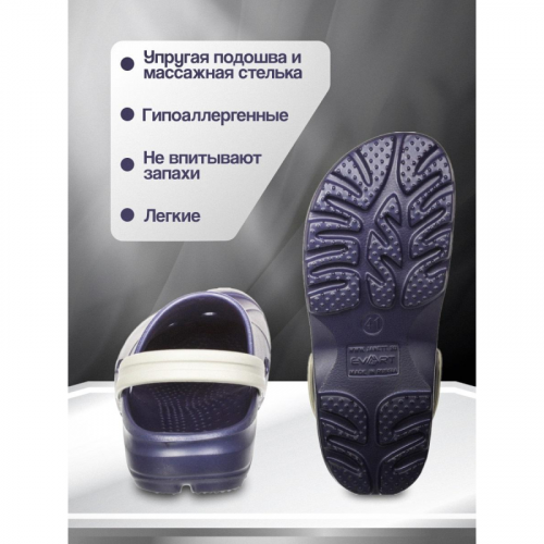 Сабо мужские EVART Ола ЭВА фиолетовые (размер 45). Обувь предназначена для сотрудников предприятий общественного питания, медицинских работников, работников пищевой и легкой промышленности. Верх и подошва изготовлены из материала ЭВА. Литьевой метод крепления подошвы повышает надежность. Сабо с открытой пяткой легко надевать и снимать. Упругая подошва и массажная стелька из мягкого материала снижают нагрузку на суставы, способствуя лучшей амортизации. Широкая носочная часть препятствует деформации пальцев ног. Отверстия по всей союзке создают циркуляцию воздуха, улучшая вентиляцию. Обувь легкая, водонепроницаемая, гипоаллергенная, не впитывает запахи и не требует особого ухода. Также не развивает бактерий и микробов. Большемерит на 1 размер. Срок годности неограничен. Минимальная рекомендованная температура эксплуатации - до -10C. Сабо соответствуют стандартам ТР ТС 017/2011. Цвет на изображении товара в интернет-магазине или в печатном каталоге может отличаться от оригинала из-за особенностей цветопередачи. Законодательные и технические документы