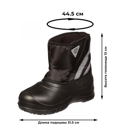 Сапоги мужские Evart Плутон ЭВА комбинированные утеплённые чёрные размер 44-45. Верх и подошва изготовлены из ЭВА, а голенище - из водонепроницаемой ткани оксфорд. Подошва легкая, с амортизирующими свойствами, выполнена из ЭВА. Метод крепления подошвы - бортопрошивной. Утеплитель состоит из флиса и полиэстера. Голенище регулируется липучкой, что позволяет подогнать сапоги под любую полноту ноги. Внутри утеплитель из флиса и ППУ3. Светоотражающая лента на голенище обеспечивает дополнительную безопасность в темное время суток. Высота голенища: 13 см. Модель маломерит на 1 размер. Минимальная температура эксплуатации составляет -10С. Срок годности не ограничен. Соответствуют требованиям ТР ТС 017/2011. Цвет на изображении товара в интернет-магазине или в печатном каталоге может отличаться от оригинала из-за особенностей цветопередачи. Законодательные и технические документы