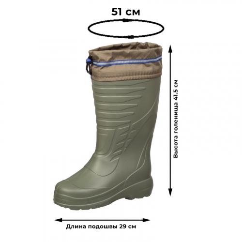Сапоги мужские Janett Тритон ЭВА оливковые размер 42-43. Рекомендуются для использования в осенне-зимний сезон для защиты ног от общих загрязнений. Верх и подошва изготовлены из прочного материала ЭВА, который отличается водоотталкивающими свойствами и легко очищается от грязи. Надставка выполнена из водоотталкивающей ткани. Метод крепления подошвы - цельнолитой, что повышает прочность конструкции. Модель большемерит на 1 размер, что необходимо учитывать при выборе. Высота голенища составляет 41,5 см. Рекомендуется использовать при температуре до -10С. Срок годности не ограничен. Соответствуют стандартам ТР ТС 017/2011. Цвет на изображении товара в интернет-магазине или в печатном каталоге может отличаться от оригинала из-за особенностей цветопередачи. Законодательные и технические документы
