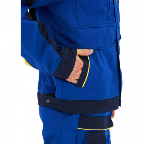 Спецодежда летняя костюм мужской л31-КБР (куртка+брюки). Размер: 52-54. Рост: 170-176. . Состав ткани: 65% полиэстер, 35% хлопок. Плотность: 240 г/кв.м. Куртка прямого силуэта. Полочки с отрезными кокетками из ткани основного цвета и кантом желтого цвета, нагрудными накладными карманами из ткани отделочного цвета. Нагрудный карман правой полочки имеет дополнительный карман на застежку молния с клапаном на контактную ленту 25 мм и петлей. Нагрудный карман левой полочки имеет дополнительный объем и клапан на застежку контактная лента 25 мм. Нижние карманы куртки накладные, сложные, имеют дополнительный объем, двойной вход сверху и сбоку (листочка) и клапана из ткани основного цвета на застежку контактная лента 25 мм. Спинка с кокеткой отделочного цвета, нижняя часть спинки с боковыми складками для объема. Рукава втачные с манжетами и шлицей в нижней части локтевого шва с притачной планкой отделочного цвета , застежка манжет на контактную ленту. Рукав 4 шовный со вставками из ткани отделочного цвета. Воротник отложной. Застежка борта на молнию с ветрозащитным клапаном на контактную ленту 25 мм и кнопку на поясе и в верхней части планки. Низ куртки на поясе. Пояс с двумя патами, регулирующими ширину пояса, застежка пат на кнопку. Брюки прямого силуэта. Передние половинки брюк имеют верхние внутренние карманы, с бочком из отделочной ткани, врезные карманы с клапанами из отделочной ткани и накладным объемным карманом справой стороны. Наколенники выполнены из ткани отделочного цвета, имеют вытачки для свободы движения и карман для защитного наколенника с застежкой на контактную ленту 25 мм. Задние половинки брюк с отрезной кокеткой из ткани отделочного цвета, имеют накладные карманы с фигурными клапанами основного цвета с застежкой на контактную ленту 25 мм. По боковым швам два накладных кармана для инструментов из ткани отделочного цвета. По линии талии пояс с пятью шлевками, в боковой части пояса - эластичная тесьма. Застежка пояса на 1 пуговицу и 1 прорезную петлю. Застежка гульфика на молнию. Сферыприменения: автомобильная, ЖКХ, легкая промышленность, логистика, нефтегазовая, озеленение, сельское хозяйство, строительство.