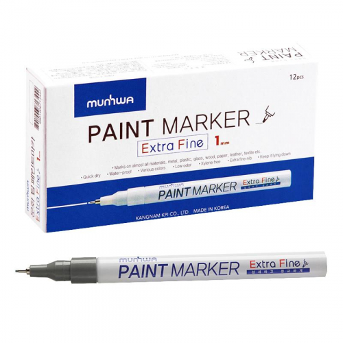 Маркер-краска MunHwa Extra Fine Paint Marker - профессиональный лаковый маркер на нитрооснове. Цвет чернил - серебристый, диаметр пишущего узла - 1 мм. Размеры маркера: диаметр 11 мм, длина 131 мм. Маркер-краска MunHwa Extra Fine предназначен для нанесения деликатной маркировки на гладкие поверхности: металл, пластмасса, резина, кожа. Подходит для маркировки фото пленок и рентгеновских снимков, имеет широкое применение в дизайне, декорировании и оформлении. Корпус маркера изготовлен из прочного алюминия. Клапанный механизм пишущего узла исключает растекание и разбрызгивание краски, преждевременное пересыхание маркера, срок годности 5 лет. Краска ложится на поверхность равномерным слоем, полностью закрашивая обрабатываемую поверхность, быстро сохнет. После высыхания надписи обладают свето и водостойкостью, термостойкостью.