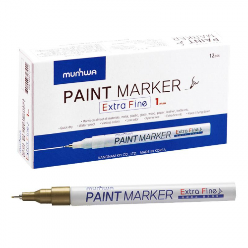Маркер-краска MunHwa Extra Fine Paint Marker - профессиональный лаковый маркер на нитрооснове. Цвет чернил - золотистый, диаметр пишущего узла - 1 мм. Размеры маркера: диаметр 11 мм, длина 131 мм. Маркер-краска MunHwa Extra Fine предназначен для нанесения деликатной маркировки на гладкие поверхности: металл, пластмасса, резина, кожа. Подходит для маркировки фото пленок и рентгеновских снимков, имеет широкое применение в дизайне, декорировании и оформлении. Корпус маркера изготовлен из прочного алюминия. Клапанный механизм пишущего узла исключает растекание и разбрызгивание краски, преждевременное пересыхание маркера, срок годности 5 лет. Краска ложится на поверхность равномерным слоем, полностью закрашивая обрабатываемую поверхность, быстро сохнет. После высыхания надписи обладают свето и водостойкостью, термостойкостью.