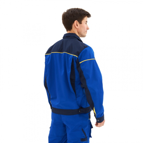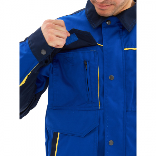 Спецодежда летняя костюм мужской л31-КПК (куртка+полукомбинезон). Размер: 60-62. Рост: 182-188. Состав ткани: 65% полиэстер, 35% хлопок. Плотность: 240 г/кв.м. Куртка прямого силуэта. Полочки с отрезными кокетками из ткани основного цвета и кантом желтого цвета , нагрудными накладными карманами из ткани отделочного цвета. Нагрудный карман правой полочки имеет дополнительный карман на застежку молния с клапаном на контактную ленту 25 мм и петлей. Нагрудный карман левой полочки имеет дополнительный объем и клапан на застежку контактная лента 25 мм. Нижние карманы куртки накладные, сложные, имеют дополнительный объем, двойной вход сверху и сбоку (листочка) и клапана из ткани основного цвета на застежку контактная лента 25 мм. Спинка с кокеткой отделочного цвета, нижняя часть спинки с боковыми складками для объема. Рукава втачные с манжетами и шлицей в нижней части локтевого шва с притачной планкой отделочного цвета , застежка манжет на контактную ленту. Рукав 4 шовный со вставками из ткани отделочного цвета. Воротник отложной. Застежка борта на молнию с ветрозащитным клапаном на контактную ленту 25 мм и кнопку на поясе и в верхней части планки. Низ куртки на поясе. Пояс с двумя патами, регулирующими ширину пояса, застежка пат на кнопку. Полукомбинезон прямого силуэта. Грудка отрезная с накладным фигурным карманом с клапаном отделочного цвета застежка клапана на контактную ленту. Передние половинки со сложными боковыми карманами и наколенниками. Наколенники выполнены из ткани отделочного цвета, имеют вытачки для свободы движения и карман для защитного наколенника с застежкой на контактную ленту 25 мм. Задние половинки имеют накладные карманы с фигурными клапанами основного цвета с застежкой на контактную ленту 25 мм. Бретели полукомбинезона с закрытой резинкой, застежка бретелей на пряжки - фастексы. Боковая застежка на 2 петли-пуговицы. Сферы применения: автомобильная, ЖКХ, легкая промышленность, логистика, нефтегазовая, озеленение, сельское хозяйство, строительство.