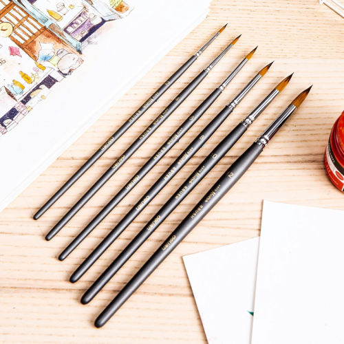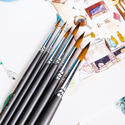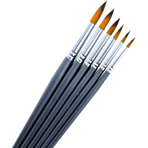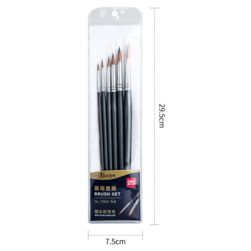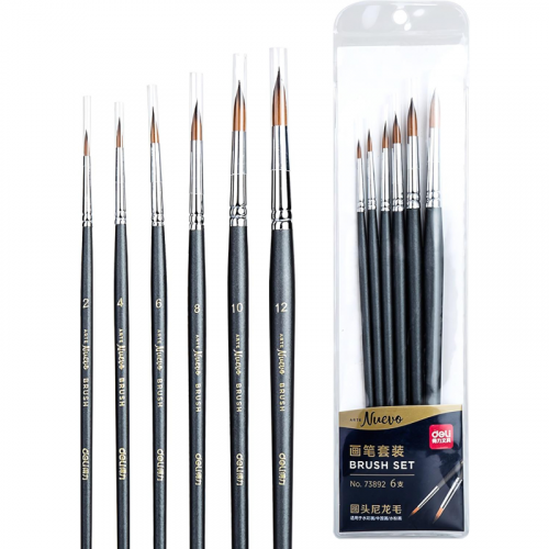 Набор кистей Deli синтетика (6 штук в наборе) деревянная ручка Прекрасные кисти из синтетического материала (нейлона) от лидирующего производителя канцтоваров в Азиатском регионе компании Deli. Ворс щетины имеет среднюю жесткость и подходит для масляных красок, акриловых, гуаши, акварели. В наборе 6 круглых кистей: № 2, 4, 6, 8, 10, 12. Алюминиевый держатель щетины не царапает бумагу во время рисования. Ручки кистей деревянные темно-синего цвета.