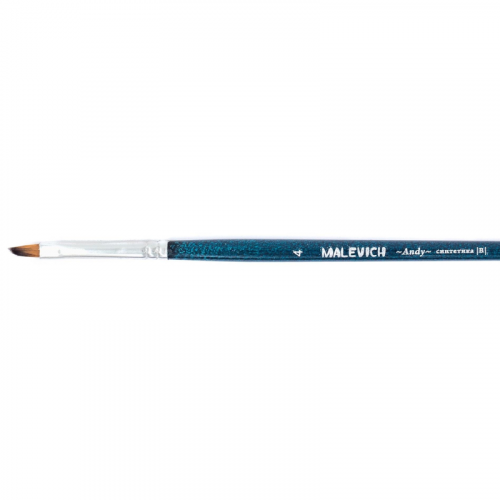 Кисть художественная Малевичъ Andy скошенная синтетика № 4 Мягкая и универсальная синтетика, которая подходит практически для любых видов красок. Ей удобно работать с гуашью, акварелью, акрилом, темперой. Маслом можно работать в лессировочной технике с разбавителем. Синтетика рыжего цвета с темным кончиком, ручка покрыта синим лаком, ворс закреплен алюминиевой втулкой с двойной обжимкой. Ручка кисти короткая - 14 см. Длина ворса (выставка) короткая. Номер кисти соответствует диаметру в мм.