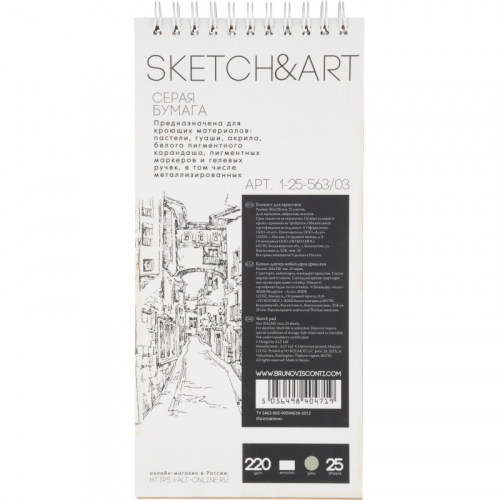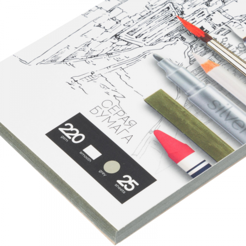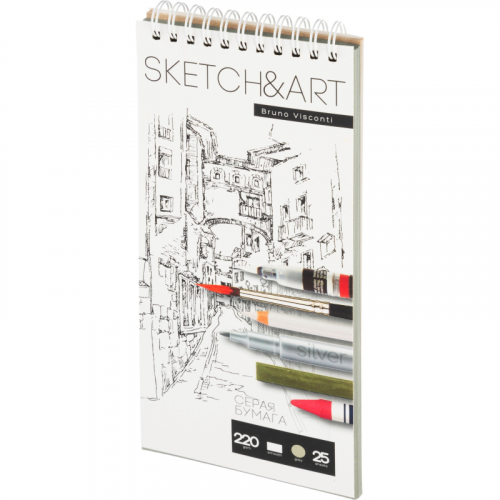 Скетчбук для маркеров Sketch&Art 105x220 мм 25 листов Бумага Sketch&Art серая плотностью 220 г/кв.м имеет разную фактуру с каждой стороны: гладкую и шероховатую. Это позволяет рисовать на ней различными кроющимися материалами: пастелью, гуашью, акрилом, белым пигментным карандашом, пигментными маркерами, гелевыми ручками, в том числе металлизированными. Серый цвет бумаги придаёт дополнительное измерение работе, довольно ощутимо меняет оттенок красящего материала. Такая бумага даёт широкий простор для творческих экспериментов и возможность рисовать теми материалами, которые действительно нравятся! Удобный формат скетчбука даёт возможность иметь его всегда под рукой, а жёсткая подложка - делать зарисовки и наброски на весу. Листы скетчбука скреплены спиралью по верхнему краю, что позволяет переворачивать их на 180 градусов. Размер листов 105x220 мм. Скетчбук приятно держать в руках благодаря бархатистому покрытию Soft Tоuch, а лаконичный, но узнаваемый дизайн привлекает к себе внимание.
