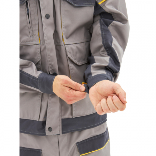 Спецодежда летняя костюм мужской л31-КПК (куртка+полукомбинезон). Размер: 44-46. Рост: 182-188. Состав ткани: 65% полиэстер, 35% хлопок. Плотность: 240 г/кв.м. Куртка прямого силуэта. Полочки с отрезными кокетками из ткани основного цвета и кантом желтого цвета , нагрудными накладными карманами из ткани отделочного цвета. Нагрудный карман правой полочки имеет дополнительный карман на застежку молния с клапаном на контактную ленту 25 мм и петлей. Нагрудный карман левой полочки имеет дополнительный объем и клапан на застежку контактная лента 25 мм. Нижние карманы куртки накладные, сложные, имеют дополнительный объем, двойной вход сверху и сбоку (листочка) и клапана из ткани основного цвета на застежку контактная лента 25 мм. Спинка с кокеткой отделочного цвета, нижняя часть спинки с боковыми складками для объема. Рукава втачные с манжетами и шлицей в нижней части локтевого шва с притачной планкой отделочного цвета , застежка манжет на контактную ленту. Рукав 4 шовный со вставками из ткани отделочного цвета. Воротник отложной. Застежка борта на молнию с ветрозащитным клапаном на контактную ленту 25 мм и кнопку на поясе и в верхней части планки. Низ куртки на поясе. Пояс с двумя патами, регулирующими ширину пояса, застежка пат на кнопку. Полукомбинезон прямого силуэта. Грудка отрезная с накладным фигурным карманом с клапаном отделочного цвета застежка клапана на контактную ленту. Передние половинки со сложными боковыми карманами и наколенниками. Наколенники выполнены из ткани отделочного цвета, имеют вытачки для свободы движения и карман для защитного наколенника с застежкой на контактную ленту 25 мм. Задние половинки имеют накладные карманы с фигурными клапанами основного цвета с застежкой на контактную ленту 25 мм. Бретели полукомбинезона с закрытой резинкой, застежка бретелей на пряжки - фастексы. Боковая застежка на 2 петли-пуговицы. Сферы применения: автомобильная, ЖКХ, легкая промышленность, логистика, нефтегазовая, озеленение, сельское хозяйство, строительство.