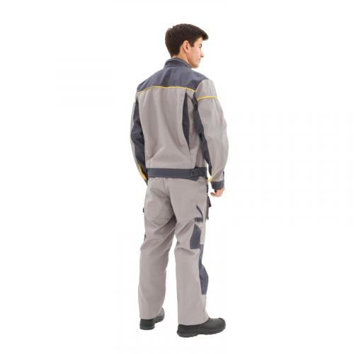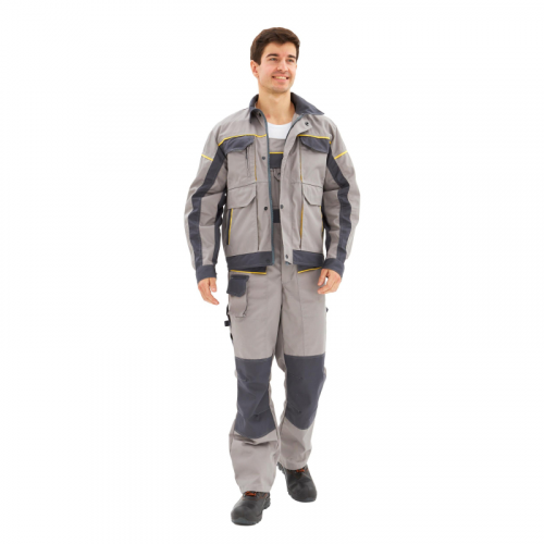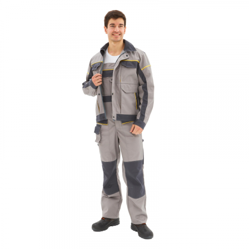 Спецодежда летняя костюм мужской л31-КПК (куртка+полукомбинезон). Размер: 44-46. Рост: 170-176. Состав ткани: 65% полиэстер, 35% хлопок. Плотность: 240 г/кв.м. Куртка прямого силуэта. Полочки с отрезными кокетками из ткани основного цвета и кантом желтого цвета , нагрудными накладными карманами из ткани отделочного цвета. Нагрудный карман правой полочки имеет дополнительный карман на застежку молния с клапаном на контактную ленту 25 мм и петлей. Нагрудный карман левой полочки имеет дополнительный объем и клапан на застежку контактная лента 25 мм. Нижние карманы куртки накладные, сложные, имеют дополнительный объем, двойной вход сверху и сбоку (листочка) и клапана из ткани основного цвета на застежку контактная лента 25 мм. Спинка с кокеткой отделочного цвета, нижняя часть спинки с боковыми складками для объема. Рукава втачные с манжетами и шлицей в нижней части локтевого шва с притачной планкой отделочного цвета , застежка манжет на контактную ленту. Рукав 4 шовный со вставками из ткани отделочного цвета. Воротник отложной. Застежка борта на молнию с ветрозащитным клапаном на контактную ленту 25 мм и кнопку на поясе и в верхней части планки. Низ куртки на поясе. Пояс с двумя патами, регулирующими ширину пояса, застежка пат на кнопку. Полукомбинезон прямого силуэта. Грудка отрезная с накладным фигурным карманом с клапаном отделочного цвета застежка клапана на контактную ленту. Передние половинки со сложными боковыми карманами и наколенниками. Наколенники выполнены из ткани отделочного цвета, имеют вытачки для свободы движения и карман для защитного наколенника с застежкой на контактную ленту 25 мм. Задние половинки имеют накладные карманы с фигурными клапанами основного цвета с застежкой на контактную ленту 25 мм. Бретели полукомбинезона с закрытой резинкой, застежка бретелей на пряжки - фастексы. Боковая застежка на 2 петли-пуговицы. Сферы применения: автомобильная, ЖКХ, легкая промышленность, логистика, нефтегазовая, озеленение, сельское хозяйство, строительство.