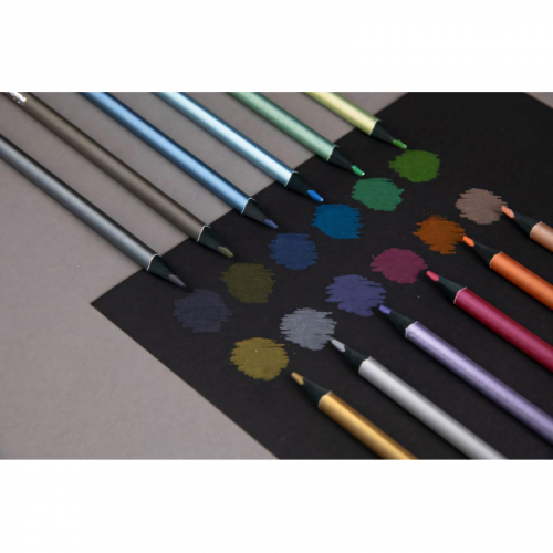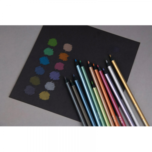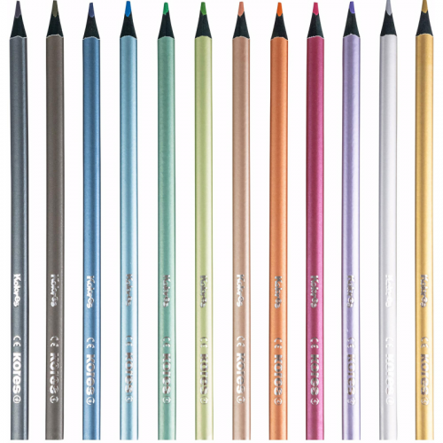 Карандаши цветные Kores Kolores Metallic Style 12 карандашей 12 цветов трёхгранные (металлические) Набор карандашей с модным эффектом металлик предназначен для рисования на тонированной бумаге тёмных цветов. Применяются в учебных заведениях и дома. Набор содержит 12 цветов. Материал корпуса - чёрное дерево. Корпус трёхгранный, диаметр 5 мм. Длина корпуса: 175 мм. Диаметр грифеля: 3 мм. Грифель разноцветный с металлическим блеском. Карандаши заточены. Форма корпуса обеспечивает удобство захвата. Упакованы в пластиковый бокс с европодвесом. Размер упаковки: 90x10x210 мм.