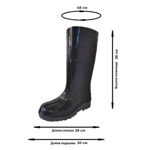 Сапоги рабочие мужские 157 ПВХ черные с металлическим подноском размер 44. Предназначены для использования в различных отраслях промышленности, где существует риск травмирования стопы. Обеспечивают защиту от ударов, проколов, падений тяжелых предметов и воздействия агрессивных жидкостей. Верх и подошва выполнены из ПВХ, устойчивого к воздействию нефти и нефтепродуктов. Металлический подносок защищает пальцы ног. Высота голенища составляет 36 см, толщина стенок варьируется от 1,8 мм до 2,8 мм. Подошва изготовлена литьевым методом из двух компонентов. Толщина подошвы составляет от 12 мм до 26 мм. Протектор самоочищающийся, с грунтозацепами, препятствующими налипанию грязи. Стелька широкая, металлическая, антипрокольная. Модель соответствует требованиям ГОСТ 12.4.072-79, ГОСТ 12.4.177-89, ГОСТ 5375-79 и ТР ТС 019/2011. Срок хранения 12 месяцев, гарантийный срок эксплуатации - 90 дней. Цвет на изображении товара в интернет-магазине или в печатном каталоге может отличаться от оригинала из-за особенностей цветопередачи монитора. ЗАКОНОДАТЕЛЬНЫЕ И ТЕХНИЧЕСКИЕ ДОКУМЕНТЫ: