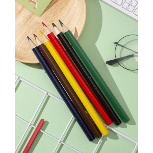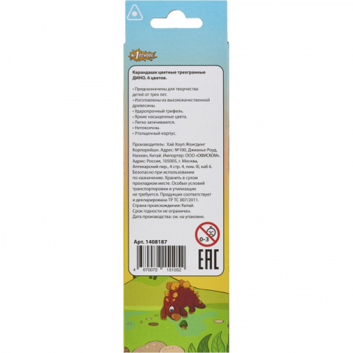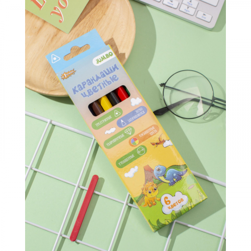 Карандаши цветные Комус Класс Дино 6 карандашей 6 цветов трёхгранные (утолщённые) Набор цветных карандашей №1 School Дино предназначен для рисования на бумаге. Применяется детьми от 3 лет и старше. В наборе 6 цветов. Карандаши с треугольным деревянным корпусом, утолщённым до 10 мм. Длина корпуса: 175 мм. Диаметр грифеля: 4 мм. Упакованы в картонную коробку с европодвесом размером 60x10x178 мм. Карандаши изготовлены из качественной древесины, ударопрочные и легко затачиваются без заусенцев. Треугольная форма позволяет удобно держать карандаш в детской руке и делает его устойчивым на поверхности стола. Нетоксичны. У карандашей утолщённый корпус. Грифели классические, легко затачиваются. Набор подходит для развития мелкой моторики и правильного захвата пишущих принадлежностей. Идеально для учебных занятий и творчества. Набор идеально подходит для выполнения разнообразных рисунков и письма.
