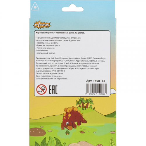 Карандаши цветные Комус Класс Дино 12 карандашей 12 цветов трёхгранные (утолщённые) Набор цветных карандашей №1 School Дино предназначен для рисования на бумаге. Применяется детьми от 3 лет и старше. В наборе 12 цветов. Карандаши с треугольным деревянным корпусом, утолщённым до 10 мм. Длина корпуса: 175 мм. Диаметр грифеля: 4 мм. Упакованы в картонную коробку с европодвесом размером 120x10x178 мм. Карандаши изготовлены из качественной древесины, ударопрочные и легко затачиваются без заусенцев. Треугольная форма позволяет удобно держать карандаш в детской руке и делает его устойчивым на поверхности стола. Нетоксичны. Особенностью карандашей является утолщённый корпус. Грифели классические, легко затачиваются. Набор подходит для развития мелкой моторики и правильного захвата пишущих принадлежностей. Идеально для учебных занятий и творчества. Набор идеально подходит для выполнения разнообразных рисунков и письма.