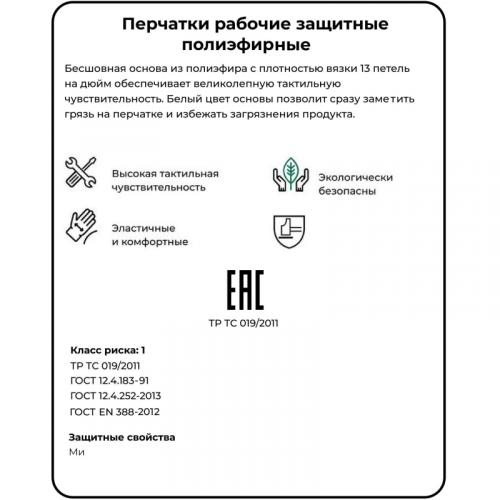 Перчатки рабочие защитные Чибис ПЭ полиэфирные белые (13 класс, размер 9, L). Перчатки выполнены из 100% полиэфира с бесшовной вязаной основой. Эти перчатки предназначены для защиты от механических воздействий и загрязнений в производственных условиях. Они обеспечивают высокую степень защиты при сохранении комфорта и тактильности.Перчатки подходят для высокоточных работ в электронной промышленности и других отраслях, где важна высокая чувствительность пальцев. Также они применимы для ремонта, сборки, такелажно-погрузочных, строительных и монтажных работ, а также для общих производственных задач.Материалы и особенности: - Основа: 100% полиэфир.- Обработка манжеты: ручной оверлок.- Повышенная прочность и тактильность.- Плотное облегание руки, создающее эффект "голых рук".Перчатки соответствуют стандартам: - ТР ТС 019/2011.- ГОСТ 12.4.183-91.- ГОСТ EN 388-2012.- ГОСТ 12.4.252-2013.Цвет на изображении товара может отличаться от оригинала из-за особенностей цветопередачи монитора.ЗАКОНОДАТЕЛЬНЫЕ И ТЕХНИЧЕСКИЕ ДОКУМЕНТЫ:
