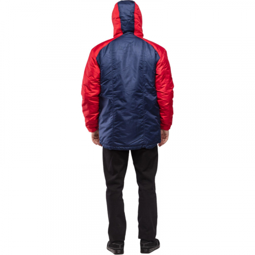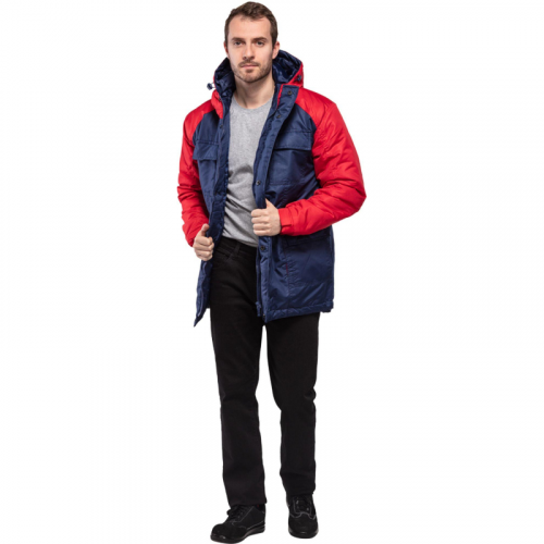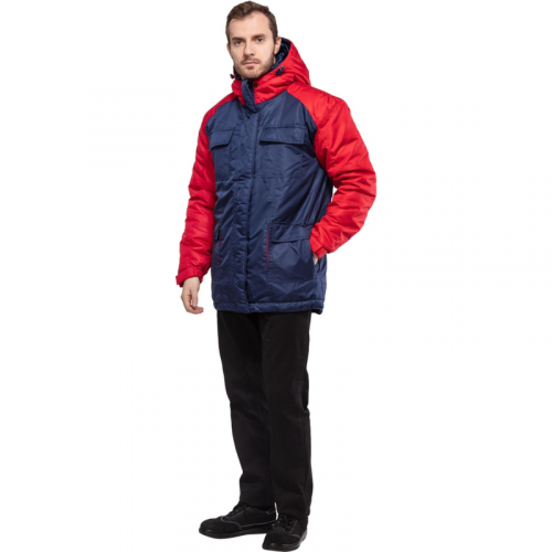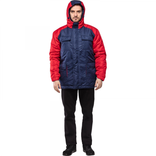 Куртка рабочая зимняя мужская з41-КУ синяя/красная (размер 60-62, рост 182-188). Рекомендуется для использования в сельском хозяйстве. Изготовлена из ткани "Таслан", имеющей специальную защитную пропитку PU, которая придает ткани водонепроницаемые и ветрозащитные свойства, а также покрытие ткани составом WR, который отталкивает влагу, позволяя ей скатываться по поверхности изделия. Сочетание пропитки PU и WR приводит к низкой водопропускающей способности ткани. Плотность ткани: 95 +/- 5 г/кв.м, состав: 100% полиэстер. Утеплитель - синтепон плотностью 240 г/кв.м (2 слоя по 120 г/кв.м). Основной цвет изделия синий, отделочный - красный. Защитные свойства: -Защищает от общих производственных загрязнений. -Защищает от пониженных температур. Куртка мужская утепленная. Есть капюшон, центральная застежка на молнию, ветрозащитная планка. Куртка имеет четыре нагрудных кармана - два с клапаном на кнопках и два прорезных на молнии, четыре боковых кармана - два с клапаном на кнопках и два прорезных на молнии. Два внутренних кармана - один накладной на липучке и один прорезной на молнии. Капюшон несъемный, состоит из трех частей. С внутренней стороны капюшона понизу проходит планка из основной ткани. Капюшон регулируется шнуром-резинкой и фиксаторами. Рукава трехшовные, втачные, с манжетой на резинке и патой на липучке. Полочки, спинка и притачные подборта выполнены из основной ткани. Кокетки, рукава и боковые части капюшона выполнены из отделочной ткани. По низу куртки проходит отделочная планка. Низ куртки регулируется при помощи шнура-резинки и фиксаторов. Соответствует ГОСТ 12.4.303-2016, ТР ТС 019/2011. Коллекция зимней рабочей одежды з41 представлена куртками з41-КУ.