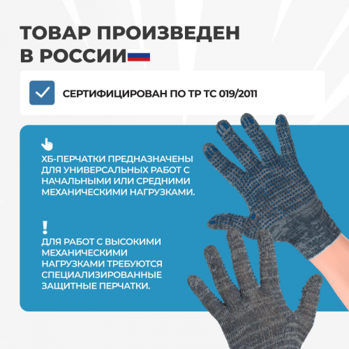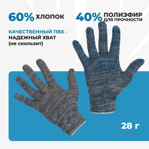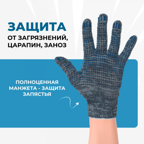 Перчатки защитные трикотажные с ПВХ покрытием Точка (7класс, размер универсальный, 300 пар/уп). Перчатки из смесовой пряжи с покрытием ПВХ предназначены для защиты рук от мелких механических повреждений и производственных загрязнений. Универсальный размер с манжетой на резинке обеспечивает плотное прилегание к руке. Перчатки подходят для различных видов работ, где требуются защитные свойства при минимальных механических нагрузках.Основой перчаток является смесовая пряжа, состоящая из 60% хлопка и 40% полиэфира. Покрытие из поливинилхлорида (ПВХ) с точечным рисунком на внутренней стороне ладони обеспечивает плотный захват и предотвращает скольжение деталей. Резиновая манжета надежно фиксирует перчатку на запястье.Перчатки предназначены для использования в строительстве, складских и общепромышленных работах. Их можно использовать при работе с инструментом и в условиях, где возможно загрязнение от пыли и грязи. Количество в упаковке: 200 пар.ЗАКОНОДАТЕЛЬНЫЕ И ТЕХНИЧЕСКИЕ ДОКУМЕНТЫ: