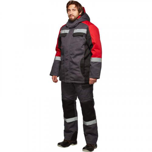 Костюм рабочий зимний мужской Формула-КПК с СОП серый/красный (размер 44-46, рост 182-188). Рекомендован для использования в логистике, легкой промышленности, тяжелой промышленности, строительстве, ЖКХ. Состоит из куртки и полукомбинезона. Состав ткани: "Орион-1" смесовая с водоотталкивающей отделкой (65% полиэстер, 35% хлопок, плотность 240 г/кв.м). Подкладка: ветрозащитная (100% полиэфир, плотность 60 +/- 5 г/кв.м). Утеплитель: полотно высокоизвилистое, силиконизированное "Аляска", плотностью 450 г/кв.м (основа) 3 слоя по 150 г/кв.м и 300 г/кв.м (руки/ноги) 2 слоя по 150 г/кв.м. Защитные свойства: -Защищает от общих производственных загрязнений. -Защищает от пониженных температур. Ветрозащитная планка с застежкой на ленту-контакт. Воротник стойка, капюшон утепленный, съемный. Фигурная линия низа и регулировка ширины куртки по талии. Полукомбинезон утепленный, с центральной застежкой на тесьму "молния". Эластичная резинка по талии спинки. Полукомбинезон с различными многофункциональными карманами. В костюме используется светоотражающая полоса 50 мм. Усилительные накладки в области колен по низу шаговых швов. Внутренний трикотажный манжет. Отрасли: ЖКХ, строительство, легкая и тяжелая промышленности, логистика. Соответствует ГОСТ 12.4.303-2016, ТР ТС 019/2011. размер Цвет на изображении товара в интернет-магазине или в печатном каталоге может отличаться от оригинала из-за особенностей цветопередачи монитора.