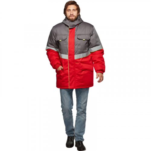 Куртка рабочая зимняя мужская з43-КУ с СОП серая/красная (размер 48-50, рост 170-176), предназначена для защиты от пониженных температур, ветра и общих производственных загрязнений. Рекомендуется для использования в сферах логистики, строительства, ЖКХ, лёгкой промышленности. Материалы Основная ткань: смесовая, состав 65% полиэстер, 35% хлопок, плотность 210 г/кв.м. Подкладка: 100% полиэстер, ткань 'Таффета', плотность 55 + 10 г/кв.м. Утеплитель: синтепон, плотность - 450 г/кв.м (основа: 3 слоя по 150 г/кв.м), 300 г/кв.м (рукава: 2 слоя по 150 г/кв.м). Пропитка: водоотталкивающая. Особенности утеплителя: термоскрепленный синтепон (евросинтепон) исключает миграцию волокон, сохраняет тепло при меньшей толщине изделия, обладает высокой пластичностью и лёгкостью. Защитные свойства Тн - защита от пониженных температур. Особенности дизайна и конструкции Тип силуэта и посадка: прямой силуэт, не стесняет движений. Индивидуальная регулировка по фигуре: кулиса по низу изделия со шляпной резинкой и фиксаторами, регулировка по линии талии с внутренней стороны. Тип застёжки: центральная двухзамковая тесьма-молния с флисовой планкой и внешним ветрозащитным клапаном на контактную ленту (четыре точки фиксации). Карманы: - наружные: нагрудные накладные с утеплёнными клапанами на липучке, с флажками-держателями; - нижние накладные карманы с утеплёнными клапанами; - внутренний карман с нашивкой для Ф.И.О. Манжеты: внутренние трикотажные напульсники, внешние манжеты частично стянуты резинкой. Рукава: втачные, с поперечным членением выше локтя. Воротник: стойка, утеплённый, внутренняя часть из флиса, с планкой для крепления капюшона. Капюшон: съёмный, утеплённый, с подбородочной частью на липучке, кулисой по лицевому срезу и затяжником на затылке. Сигнальные элементы: СОП шириной 5 см на полочках, спинке и рукавах с кантом 3 мм лимонного цвета. Особенности швов: двойная отделочная строчка по кокеткам и клапанам, усиленные участки. Рекомендации по уходу Стирка при температуре до 40 C. Не отбеливать. Глажение при температуре не выше 110 C. Допускается химчистка. Соответствие стандартам Изделие изготовлено в соответствии с ГОСТ 12.4.303-2016 и ТР ТС 019/2011. Температурный режим эксплуатации: от −25 C до −41 C. Климатический пояс: 4.