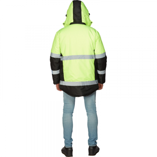 Куртка рабочая зимняя мужская 344-КУ с СОП черная/лимонная (размер 56-58, рост 170-176). Рекомендована для использования в сфере логистики, легкой промышленности. Состав ткани: 100% полиэстер (плотность 160 г/кв.м.). Ткань "кошачий глаз" (Cat"s Eye) имеет оригинальную фактуру, что придает изделию из этой ткани эффектный внешний вид. Эта ткань зарекомендовала себя как износостойкая и водоотталкивающая ткань. Оригинальное покрытие TPU обеспечивает защиту от неблагоприятных погодных явлений. "Кошачий глаз" - многофункциональная курточная ткань и может использоваться при производстве различных видов верхней одежды. Утеплитель из синтепона, плотностью - 360 г/кв.м (основа) 3 слоя по 120 г/кв.м и 240 г/кв.м (руки) 2 слоя по 120 г/кв.м. Технология изготовления термоскрепленного синтепона (евросинтепона) позволяет использовать данный утеплитель для создания более тонких изделий с сохранением термозащитных свойств. Важными преимуществами утеплителя являются легкость и хорошая пластичность, что улучшает подвижность в костюме. А также исключение миграции волокна через ткани верха и подкладки за счет скрепления слоев. Синтепон - легкий и объемный утеплитель, обладающий хорошим теплоудерживающим эффектом. Гипоаллергенный, не является средой для развития клещей, моли и плесени. Утепленная синтепоном куртка предназначена для работ на улице. Защитные свойства: -Защищает от общих производственных загрязнений. -Защищает от пониженных температур. Куртка застегивается на молнию и кнопки. Куртка с утепленным капюшоном. Воротник-стойка. Внутренняя отделка флисом, два утепленных боковых кармана, накладной карман под телефон, окошко для бейджа. Есть внутренний карман для документов. Световозвращающие полосы на полочках, спине и рукавах позволяют видеть человека в условиях ограниченной видимости. Климатический пояс: III. Соответствует ГОСТ 12.4.303-2016, ТР ТС 019/2011.