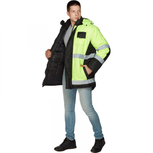 Куртка рабочая зимняя мужская 344-КУ с СОП черная/лимонная (размер 44-46, рост 182-188). Рекомендована для использования в сфере логистики, легкой промышленности. Состав ткани: 100% полиэстер (плотность 160 г/кв.м.). Ткань "кошачий глаз" (Cat"s Eye) имеет оригинальную фактуру, что придает изделию из этой ткани эффектный внешний вид. Эта ткань зарекомендовала себя как износостойкая и водоотталкивающая ткань. Оригинальное покрытие TPU обеспечивает защиту от неблагоприятных погодных явлений. "Кошачий глаз" - многофункциональная курточная ткань и может использоваться при производстве различных видов верхней одежды. Утеплитель из синтепона, плотностью - 360 г/кв.м (основа) 3 слоя по 120 г/кв.м и 240 г/кв.м (руки) 2 слоя по 120 г/кв.м. Технология изготовления термоскрепленного синтепона (евросинтепона) позволяет использовать данный утеплитель для создания более тонких изделий с сохранением термозащитных свойств. Важными преимуществами утеплителя являются легкость и хорошая пластичность, что улучшает подвижность в костюме. А также исключение миграции волокна через ткани верха и подкладки за счет скрепления слоев. Синтепон - легкий и объемный утеплитель, обладающий хорошим теплоудерживающим эффектом. Гипоаллергенный, не является средой для развития клещей, моли и плесени. Утепленная синтепоном куртка предназначена для работ на улице. Защитные свойства: -Защищает от общих производственных загрязнений. -Защищает от пониженных температур. Куртка застегивается на молнию и кнопки. Куртка с утепленным капюшоном. Воротник-стойка. Внутренняя отделка флисом, два утепленных боковых кармана, накладной карман под телефон, окошко для бейджа. Есть внутренний карман для документов. Световозвращающие полосы на полочках, спине и рукавах позволяют видеть человека в условиях ограниченной видимости. Климатический пояс: III. Соответствует ГОСТ 12.4.303-2016, ТР ТС 019/2011.