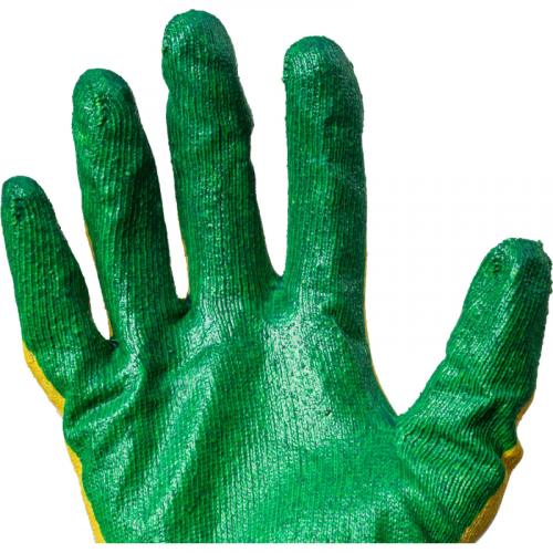 Перчатки рабочие защитные хлопковые трикотажные с двойным латексным покрытием белые/зеленые (13 класс, универсальный размер, 200 пар в упаковке). Покрытие: латексное неполное двухслойное. Количество в упаковке: 200 пар.Перчатки предназначены для использования в сухих и влажных условиях. Подходят для различных видов работ в таких отраслях, как пищевая, строительная, легкая промышленность. Они обеспечивают защиту рук от загрязнений и механических повреждений, а также обладают водоотталкивающими свойствами в зоне покрытия.Латексное покрытие на ладони обеспечивает хорошую цепкость и защиту. Двойное покрытие повышает износостойкость и долговечность, что делает перчатки более эффективной альтернативой ПВХ моделям. В жаркое время года они не вызывают потливости на ладонях, а в холодное время помогают сохранять тепло.Уникальные особенности:- Латексное покрытие (неполное двухслойное).- Повышенная цепкость.- Легкие водоотталкивающие свойства.- Защита от загрязнений и механических повреждений.- Эффективная альтернатива ПВХ перчаткам.Стандарты:- ГОСТ 12.4.252-2013.- ТР ТС 019/2011.- ГОСТ 12.4.183-91.Цвет товара на изображении может отличаться от реального из-за особенностей цветопередачи монитора.ЗАКОНОДАТЕЛЬНЫЕ И ТЕХНИЧЕСКИЕ ДОКУМЕНТЫ: