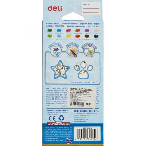 Карандаши цветные Deli Paw Patrol 12 карандашей 12 цветов трёхгранные Карандаши цветные Deli Paw Patrol предназначены для рисования на бумаге. Применяются в учебных заведениях и дома. Рекомендованный возраст от 3 лет. Набор содержит 12 цветов. Материал корпуса - древесина. Корпус трёхгранный, диаметр: 7 мм. Длина корпуса: 175 мм. Диаметр грифеля: 3 мм. Грифель разноцветный. Карандаши заточены. Форма корпуса обеспечивает удобство захвата. Упакованы в картонную коробку с европодвесом. Размер упаковки: 86x8x203 мм. В комплекте открытка-раскраска.