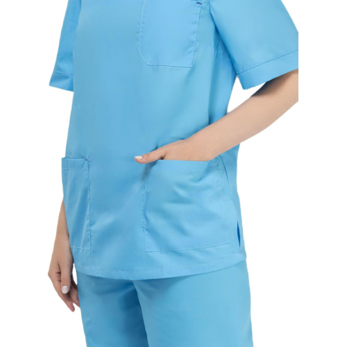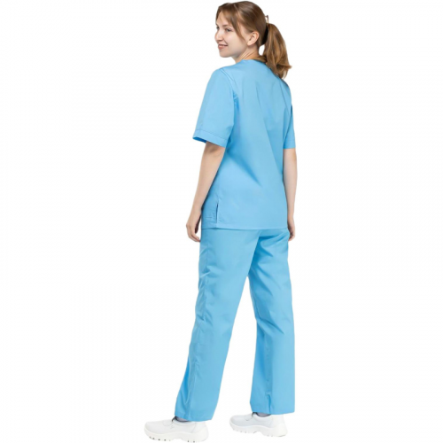 Костюм медицинский женский м05-КБР плюс голубой (размер 56-58, рост 170-176)Костюм м05-КБР плюс предназначен для защиты от общих производственных загрязнений. Модель обеспечивает свободу движений и комфорт в процессе работы. МатериалыОсновная ткань: Ти-Си, плотность 120 г/м#, состав 65% полиэстер, 35% хлопок.Защитные свойстваЗ - защита от общих производственных загрязнений.Особенности дизайна и конструкцииТип силуэта и посадка свободные, не стесняют движения. Куртка с коротким рукавом, тремя накладными карманами (один нагрудный, два боковых). Брюки прямые, с эластичной резинкой на талии, карманы на брюках отсутствуют.Рекомендации по уходуСтирка при температуре не выше 40 C.Запрещено отбеливание и химчистка.Глажение при температуре до 110 C.Продукция не является изделием медицинского назначения, производится согласно требованиям ГОСТ 12.4.280-2014. Рекомендуется для работников медицинских, санитарных, лечебно-профилактических и других организаций или учреждений здравоохранения: высший, средний и младший персонал (врачи, медицинские сестры, акушеры, техники, лаборанты, массажисты, фармацевты, сиделки, санитарки и т.д.), административно-хозяйственной группы (заведующие, кладовщики, кухонный персонал и т.д.). target="_blankПодобрать размерЦвет товара на изображении в интернет-магазине или в печатном каталоге может отличаться от оригинала из-за особенностей цветопередачи монитора.