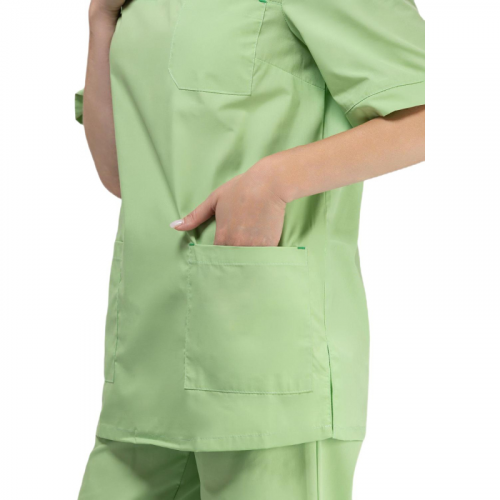 Костюм медицинский женский м05-КБР плюс зеленый (размер 52-54, рост 170-176)Костюм м05-КБР плюс предназначен для защиты от общих производственных загрязнений. Модель обеспечивает комфорт и свободу движений, сочетая практичность и аккуратный внешний вид. МатериалыОсновная ткань: Ти-Си, плотность 120 г/м#, состав 65% полиэстер, 35% хлопок.Защитные свойстваЗ - защита от общих производственных загрязнений.Особенности дизайна и конструкцииТип силуэта и посадка свободные, не стесняют движения. Куртка с коротким рукавом, тремя накладными карманами (один нагрудный, два боковых). Брюки прямые, с эластичной резинкой на талии, карманы на брюках отсутствуют.Рекомендации по уходуСтирка при температуре не выше 40 C.Запрещено отбеливание и химчистка.Глажение при температуре до 110 C.Продукция не является изделием медицинского назначения, производится согласно требованиям ГОСТ 12.4.280-2014. Рекомендуется для работников медицинских, санитарных, лечебно-профилактических и других организаций или учреждений здравоохранения: высший, средний и младший персонал (врачи, медицинские сестры, акушеры, техники, лаборанты, массажисты, фармацевты, сиделки, санитарки и т.д.), административно-хозяйственной группы (заведующие, кладовщики, кухонный персонал и т.д.). target="_blankПодобрать размерЦвет товара на изображении в интернет-магазине или в печатном каталоге может отличаться от оригинала из-за особенностей цветопередачи монитора.