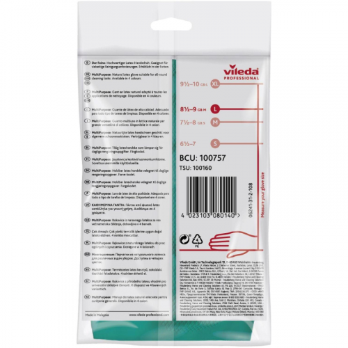 Перчатки Многоцелевые от Vileda Professional из латекса, размер L, предназначены для профессиональной уборки и другого широкого круга задач, включая уборку помещений и работу с продуктами питания. Защищают от вирусов. Перчатки Многоцелевые эффективно защищают руки во время уборки. Подходят для использования с разведенными моющими средствами и дезинфектантами. Желтые и синие перчатки с ограничением подходят для работы с продуктами питания в столовых, кафе, барах и на кухнях. Применимы для работы на сухих и влажных участках. Особенности и преимущества: Высокая сопротивляемость химикатам и моющим средствам - класс Type B- KLP по стандарту EN ISO 374-1. Износостойкие и долговечные - протестированы на механическую защиту тип 1010Х по стандарту EN 388. Защищают от бактерий, возбудителей грибковых заболеваний и вирусов. Протестированы по стандарту EN 374-5 на герметичность. Соответствуют EAC ТР ТС 019/2011. СЕ Категория III- максимальная защита от рисков по европейским стандартам. Цветовая кодировка для исключения перекрестных загрязнений. Высокая прочность натурального латекса и удобная анатомическая посадка для максимального комфорта. Хлопковое напыление внутри для комфорта во время работы и легкого надевания и снятия перчатки. Плотные и эластичные, приятные на ощупь. Область применения: Идеальны для уборки коммерческой и некоммерческой недвижимости, объектов здравоохранения, производств и HoReCa. Перчатки латексные Многоцелевые - это высококачественный инструмент для эффективной, экологичной и профессиональной уборки. Характеристики: Размер: длина - 29 см, ширина - 11.2 см. Толщина: 0.4 мм по гладкой стороне. Вес: средний вес 1 перчатки - 32 г, пары в упаковке - 61.5 г. (зависит от размера). Состав: латекс (натуральная резина), наполнитель, вулканизирующие агенты, стабилизаторы, оксид цинка, цветовые пигменты, хлопковое напыление, ZDEC (диэтилдитиокарбамат цинка). Ориентация: анатомическая (левая и правая).